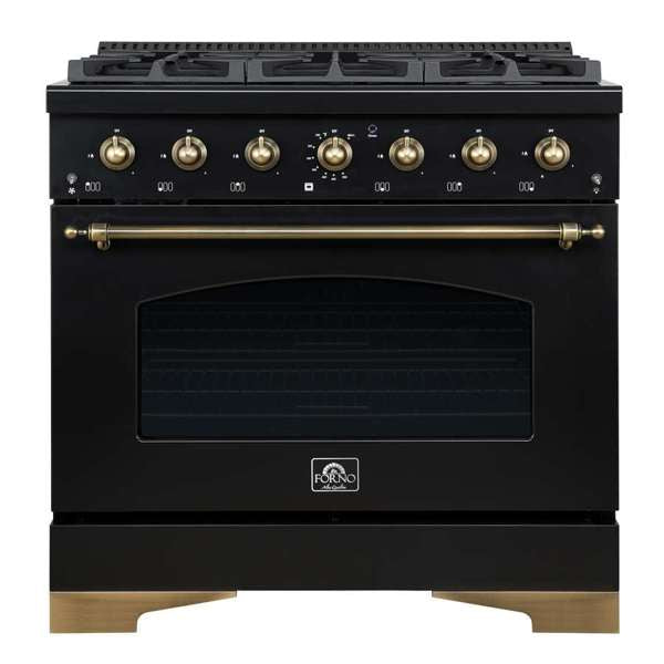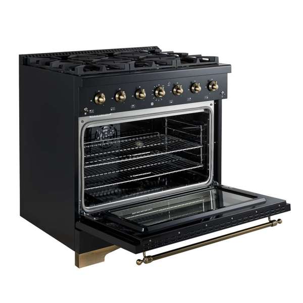 Discover the perfect blend of style and performance with the Antico 36" Dual Fuel Range. Designed for culinary enthusiasts, it features 6 sealed burners delivering a powerful 71,000 BTU, including a dual-ring brass burner with 20,000 BTU for searing and 1,000 BTU for simmering. The spacious 4.5 cu.ft convection oven ensures even baking and roasting, while the recessed enamel cooktop makes cleanup effortless. Finished in sleek black with antique brass accents, this range brings timeless elegance to your kitchen. Durable cast-iron grates provide stability and smooth cookware movement. Backed by a 2-year warranty, the Antico range combines professional-grade quality with vintage charm, making it the centerpiece of your culinary space.