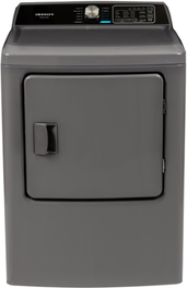 This Crosley electric dryer (model CDME70105DX) offers a 7.0 cu. ft. capacity with a moisture sensor and 10 cycles. It features 4 dryness levels, a drum light, and a wrinkle prevent option. Its dimensions are approximately 41.8 inches in height, 27 inches in width, and 30.7 inches in depth. It requires 120V power and comes with a 1-year parts and labor warranty.