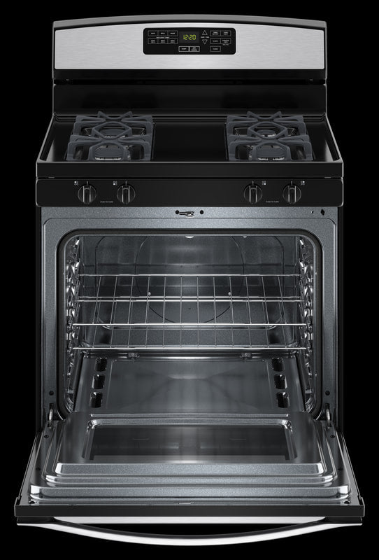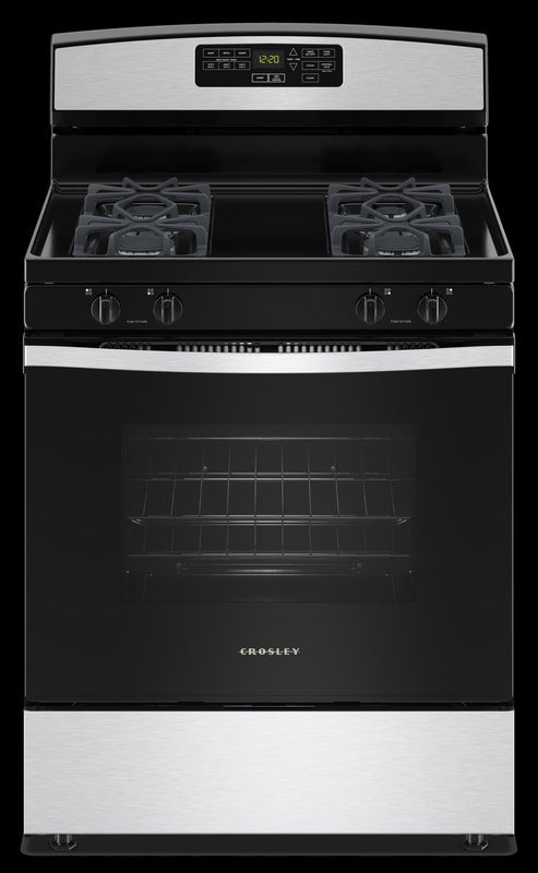 CROSLEY FREE-STANDING GAS RANGE CRGW3487RS - 5.0 cu. ft. oven capacity. Self-clean oven. Large Window. 2- High Power 15,000 BTU burner. 9,500 BTW burners. 5,000 BTU Precise Simmer burner. 8,000 BTU Oval Center burner. Continuous Coated Cast Iron grates. Sealed cooktop burners. In-oven broil. Height: (inches) 46.88. Width: (inches) 29.88. Depth : (inches) 27.88.