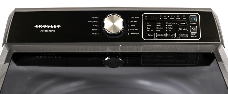 This Crosley top load washer (model CWM41154DW) offers a 4.1 cu. ft. capacity stainless steel tub with a dual-action agitator. It features auto load sensing, a deep water fill option, 10 cycles, 5 wash options, 4 soil levels, and 4 temperature settings. Cycle status indicators, a wide opening slow-close glass lid, a 680 RPM spin speed, an extra rinse selector, and a fabric softener dispenser are also included. It requires 120V power and comes with a 1-year parts and labor warranty. Its dimensions are approximately 42.13 inches in height, 25.75 inches in width, and 26.93 inches in depth.
