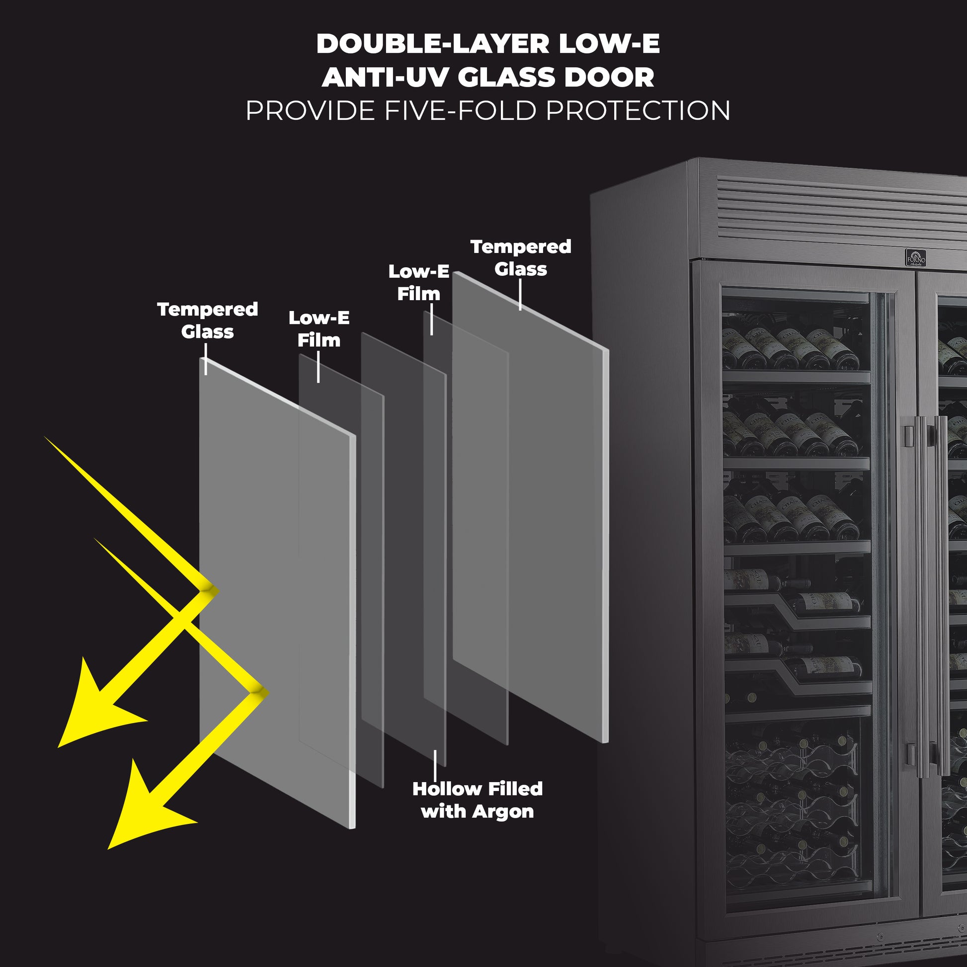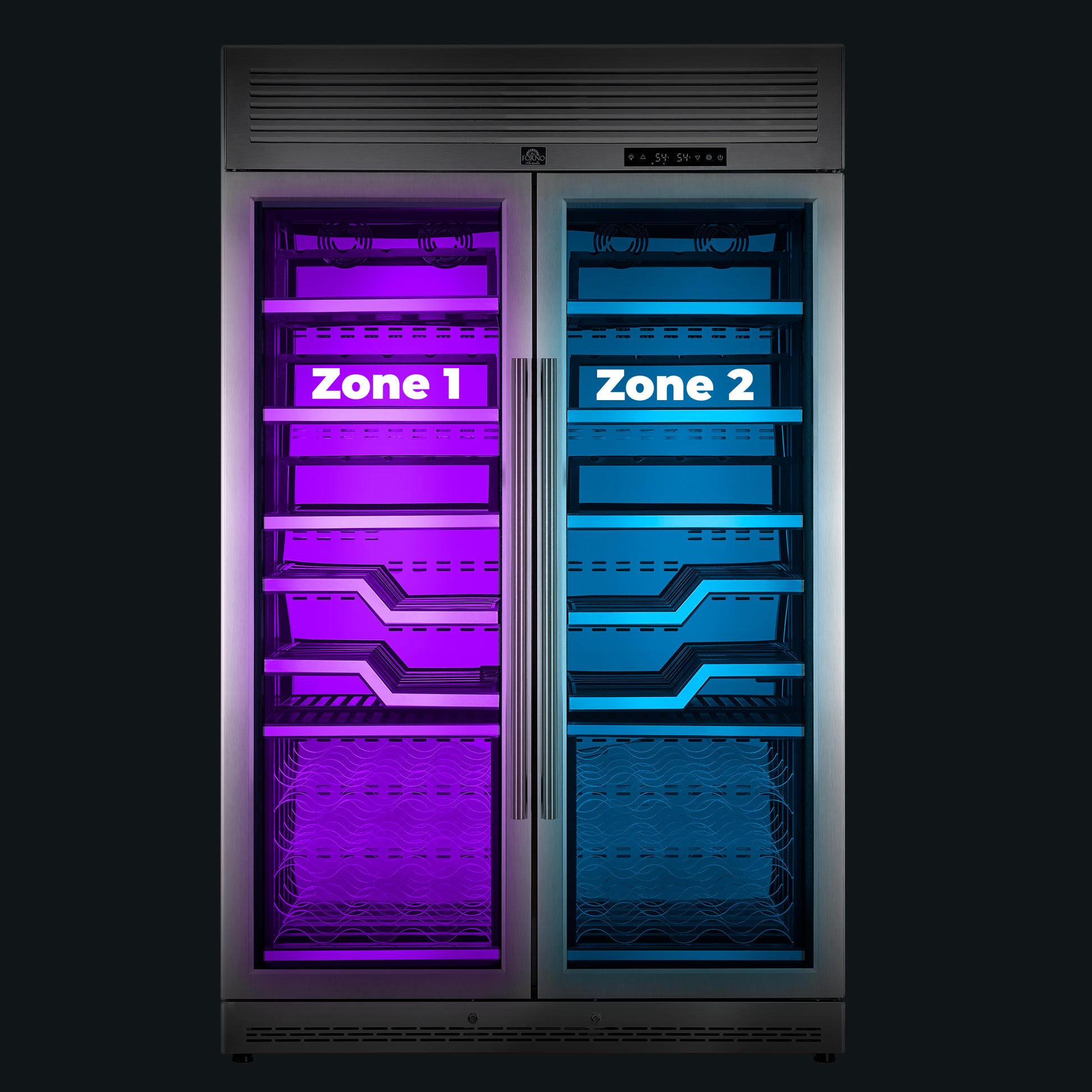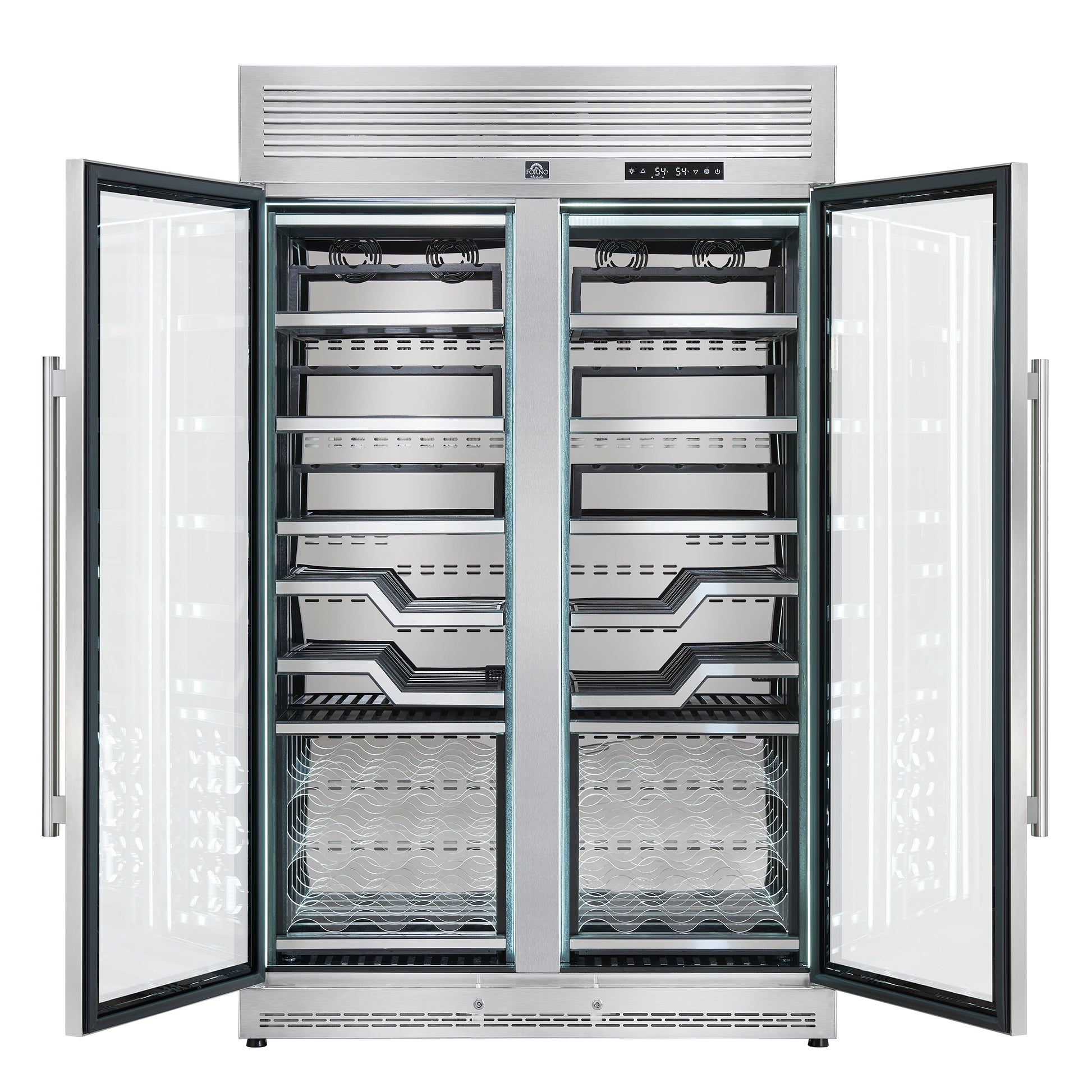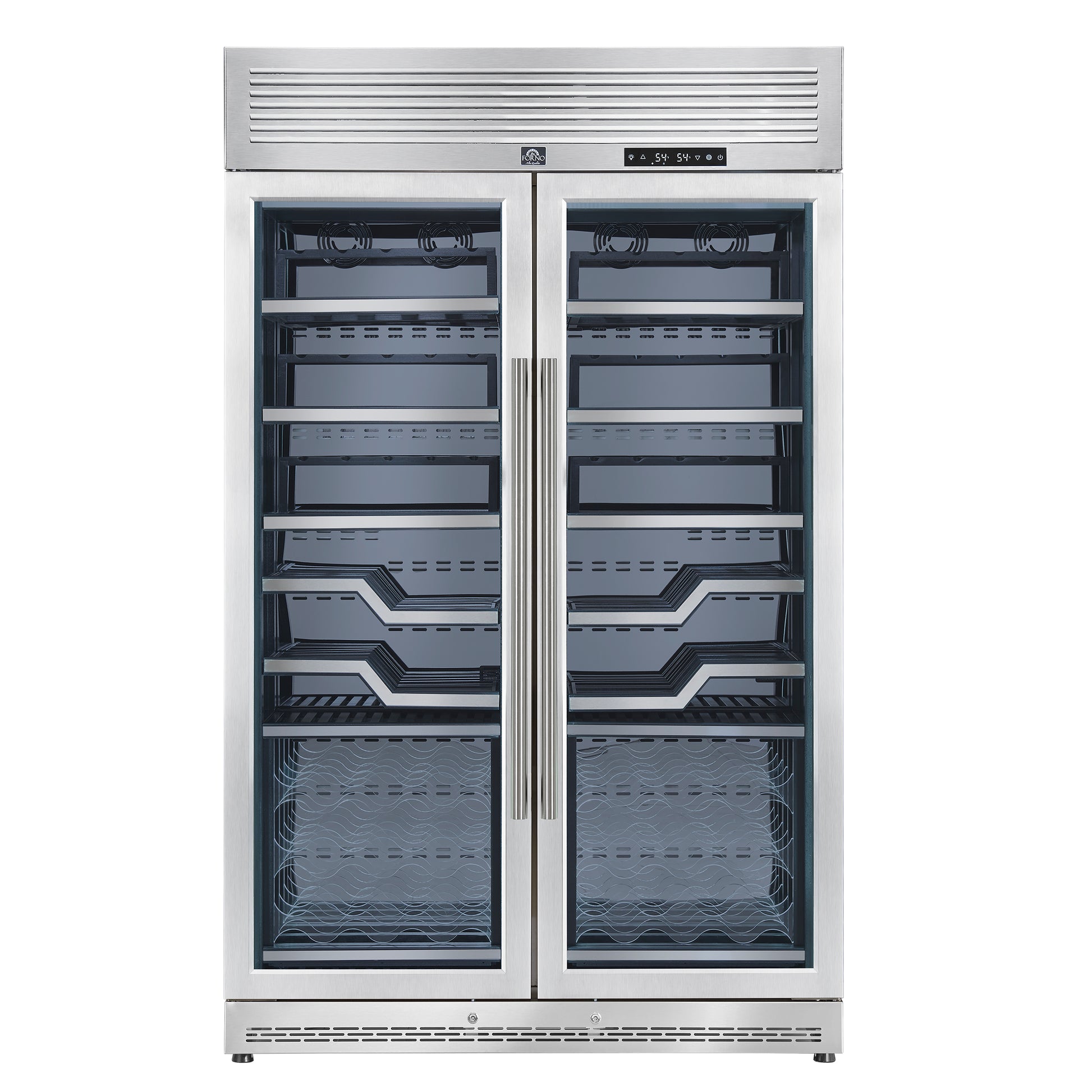 Designed for wine enthusiasts, the Forno Abruzzo 48-Inch Dual Zone Wine Cellar blends elegance, innovation, and superior craftsmanship. With a 102-bottle capacity and 24 cu. ft. of storage, it ensures your collection stays in peak condition. Dual temperature zones keep reds and whites at optimal conditions, enhancing flavor and longevity. The double-layer anti-UV glass door shields against harmful light, while a charcoal air filter maintains a pure aging environment. Label-view and Z-shaped shelves with stainless steel trim optimize organization and access, while clear acrylic bottle holders add a modern touch. Digital touch controls ensure precise temperature settings, and crisp 6000K LED lighting beautifully showcases your collection without affecting quality. A top-mounted inverter compressor maximizes storage, improves cooling efficiency, and operates quietly. An integrated lock safeguards your vintages, ensuring only the right hands have access. Superior technology and timeless elegance—Forno Abruzzo redefines wine preservation. Forno, lower the cost of living.