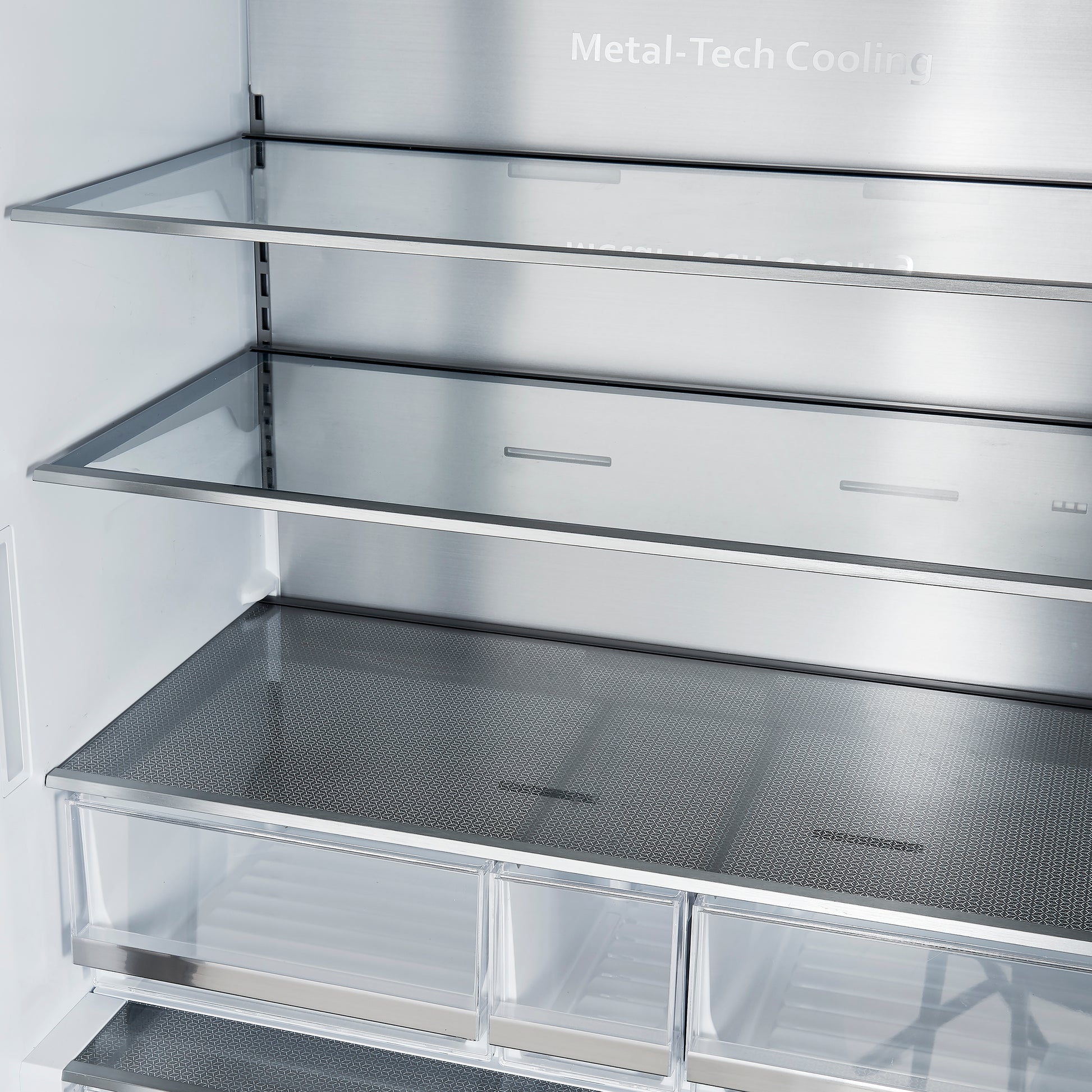 Enhance your kitchen with the Forno Aosta 36-Inch French Door Refrigerator. Offering 15.5 cu.ft. of fresh food storage and 6.9 cu.ft. of freezer space, it meets all your grocery needs. The fresh food compartment features 2 crisper drawers, a snack drawer, and a deli drawer for optimal organization. Cantilever adjustable shelves and a premium stainless steel back panel with silver trim add versatility and style. The freezer offers 3-tier metal glide drawers and an extra extendable tray to store large items like pizza boxes. With an automatic ice maker producing 2.6 lbs daily and an external water dispenser, enjoy convenient access to chilled water and ice. Super Cool and Super Freeze functions ensure groceries stay fresh longer. Backed by Forno's 2-year warranty, this ENERGY STAR-certified refrigerator combines efficiency, durability, and sleek design. Lower the cost of living with Forno Appliances.