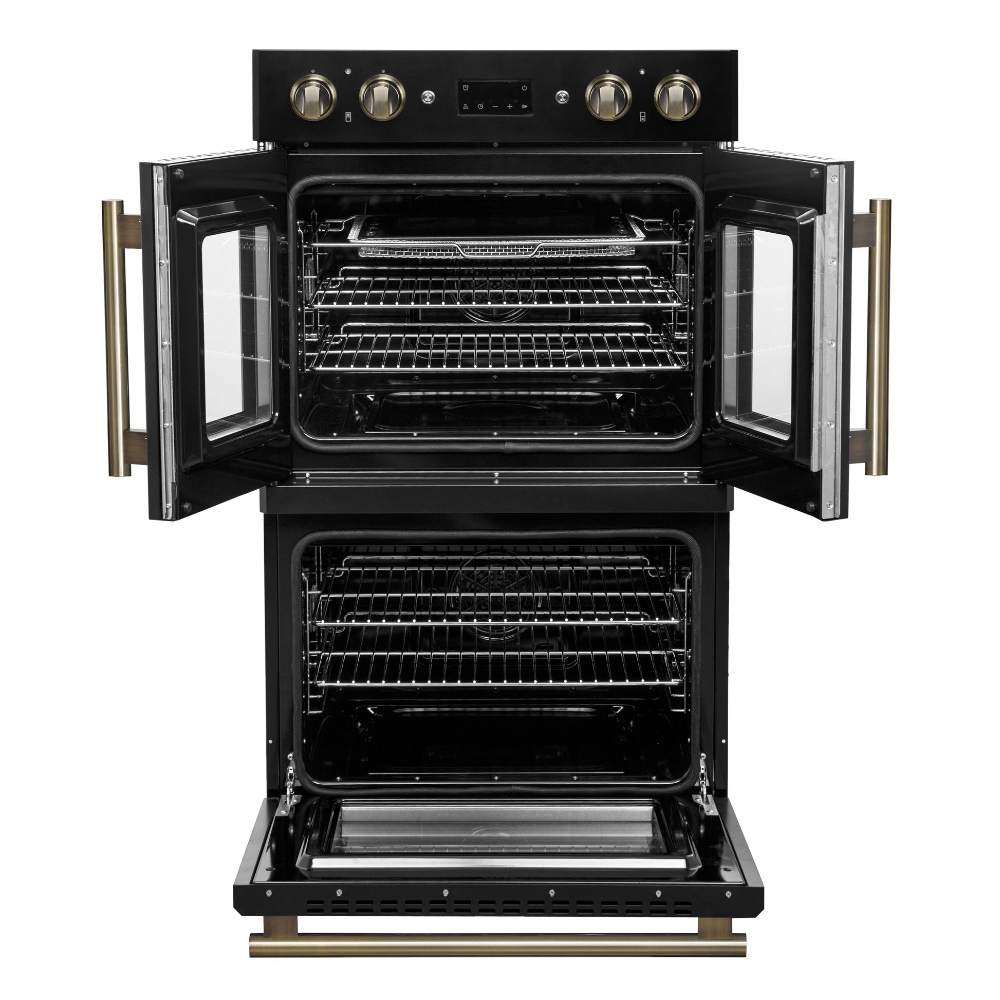 Forno Asti 30-Inch Double Electric Wall Oven with Upper French Doors in Black & Antique Brass, 7.36 cu. ft. Dual True Convection, 7,200W, Air Fry, Sous Vide, Self-Clean