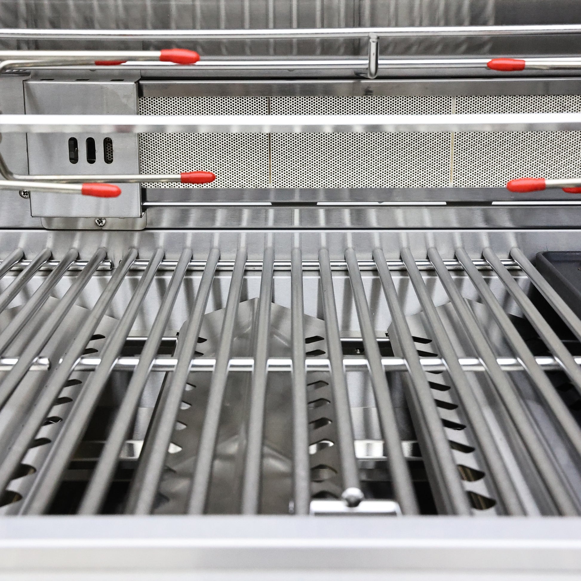 Cook, chill and entertain with this full-featured 40 inch Outdoor Kitchen Set, featuring 304 stainless steel burners, elegant black sintered stone countertops, a cast iron griddle, side burner, rotisserie kit, beverage center, halogen lights, and a roomy 38 inch x 18 inch grill surface for big outdoor feasts.