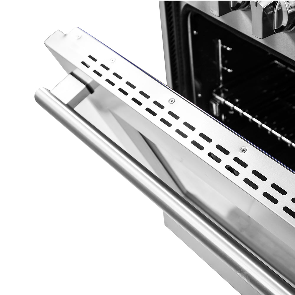 The Forno 30 Inch Capriasca Dual Fuel Range brings professional styling and Performance into your home kitchen with its durable and beatiful 304 grade stainless-steel design. Cooking surface has 5 sealed dual-ring brass burners with a total output of 100,000 BTU. 20K dual-ring burner for boiling or searing and is able to perform simmering like melting chocolate or sauces, Continuous heavy-duty cast-iron grates allow for easily sliding pots or pans off heat when desired. This 4.32 cu.ft. true convection fan oven has an impressive blue enamel interior, allowing for easy cleaning. The 3-layer glass oven door window provides both heat retention and an unobstructed view. This oven also boasts a total output of 6,300 Watts, providing plenty of power for baking, roasting, and broiling. Included are 3 fully telescopic easy access stainless steel oven racks, concave Wok Ring and LP conversion kit. Additionally, zinc coated metal knobs with bezel rings will maintain their beauty for years.