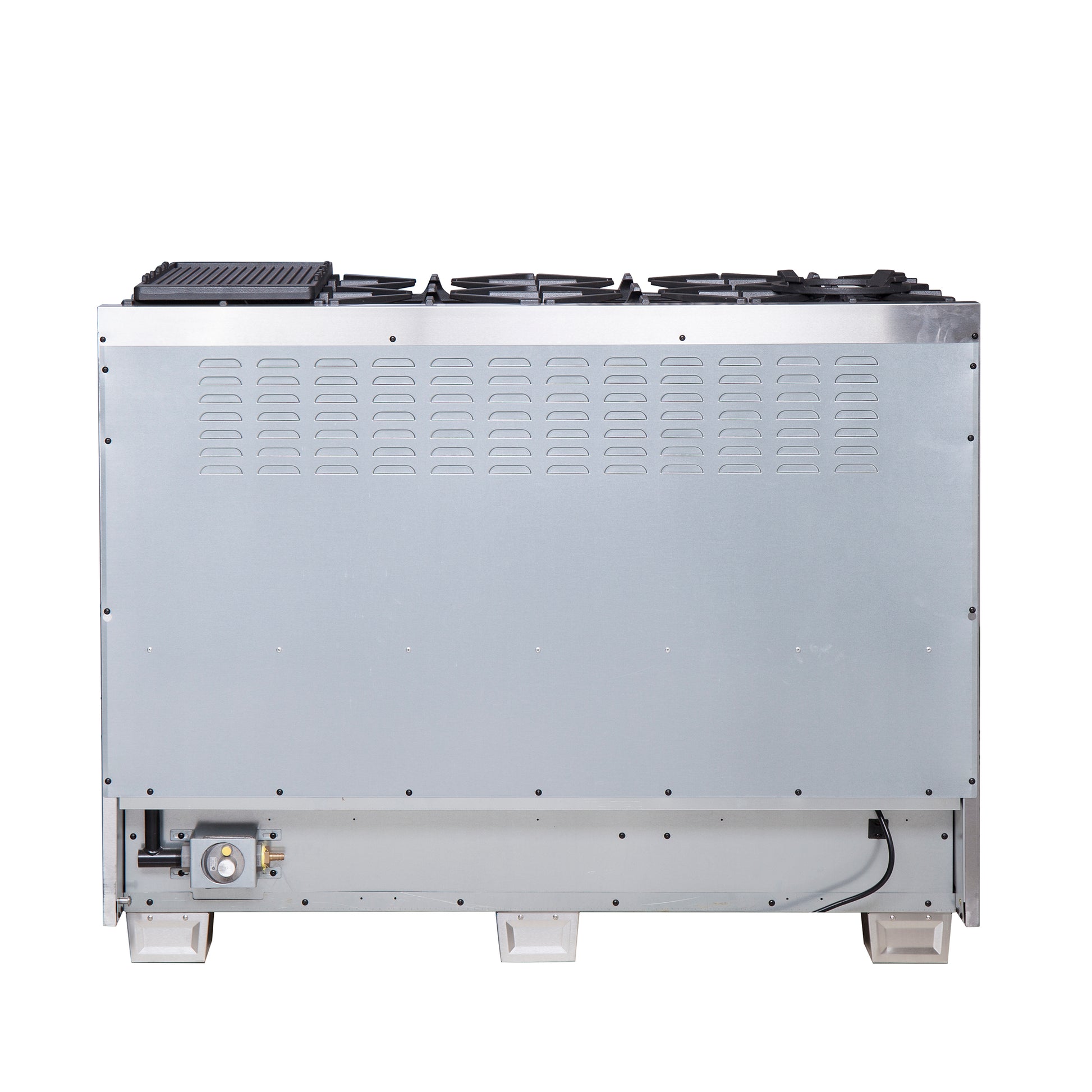 The Forno Capriasca 48 Inch French Door Gas Range enhances your home kitchen with professional styling and performance through its durable and beautiful 304-grade stainless-steel design. The cooking surface features 8 sealed dual-ring brass burners, totaling 160,000 BTU. All burners, each at 20,000 BTU, can simmer precisely at 1,000 BTU. Continuous heavy-duty cast-iron grates facilitate easy sliding of pots or pans off heat over the enamel cooktop cavity, simplifying spill cleanup. The 6.58 cu. ft. double ovens, with a 44,000 BTU output, are enclosed in a blue enamel interior. The 4.32 cu.ft. main oven offers a powerful 10,000 BTU infrared mesh broiler, a rotisserie skewer and a convection fan for precise, and consistent cooking on multiple levels. The package includes 6 telescopic stainless-steel oven racks, 1 rotisserie kit, wok support, griddle, air-fryer kit and an LP conversion kit. Additionally, zinc-coated illuminated metal knobs with bezel rings ensure enduring beauty.