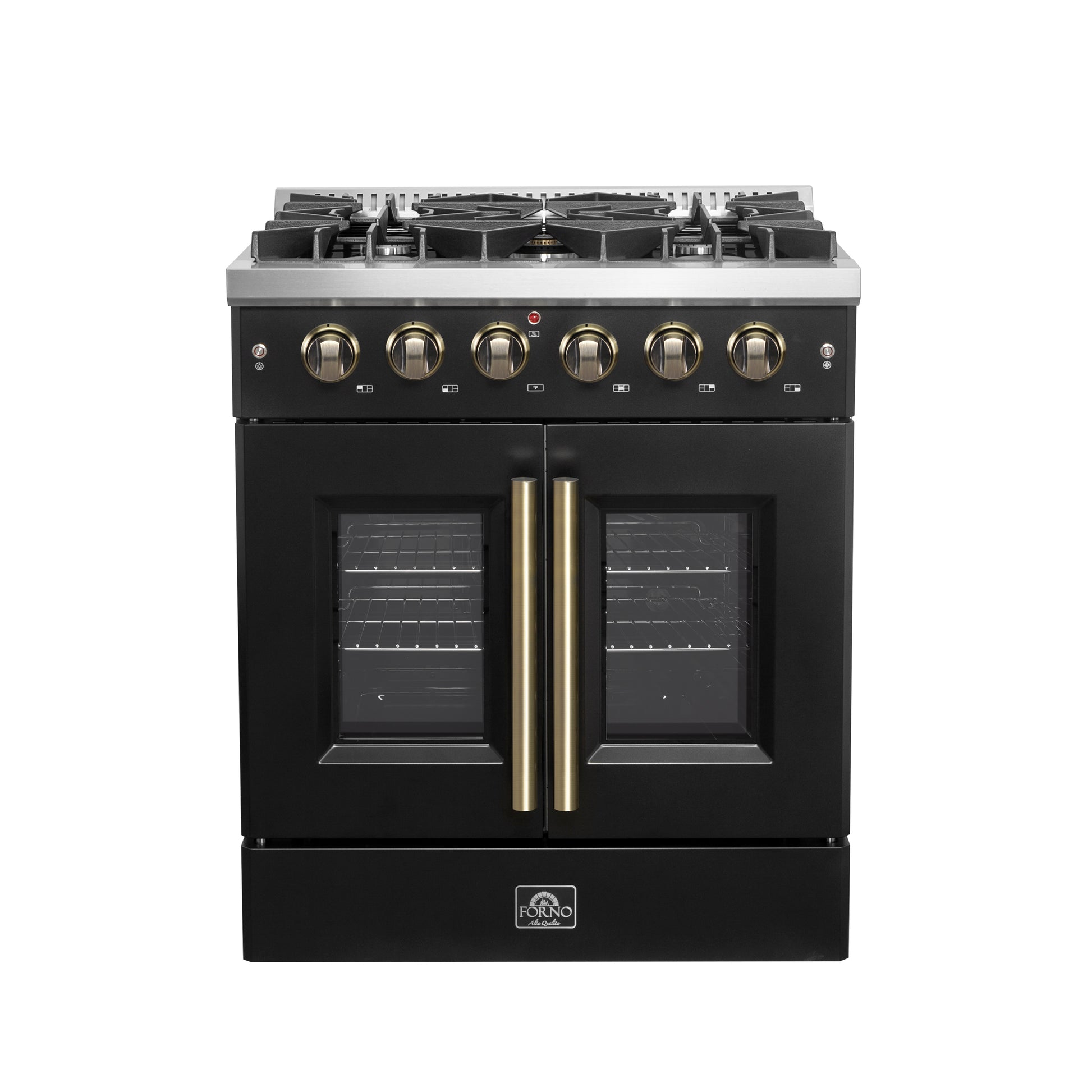 The Forno Galiano 30" French Door Gas Range in black brings professional styling and performance into your home kitchen at an affordable price. Enjoy effortless access to your oven with French doors that offer an extra 12 inches of space. The cooking surface has four sealed burners with a total output of 68,000 BTU - one of which is a 20,000 BTU dual-ring burner that can reach a precise simmer of 1,000 BTU. Cast iron grates ensure stability over the cooktop, making spills easy to clean. With a powerful 30,000 BTU output, the 4.32 cu. ft. oven features a sleek black enamel interior and a convection fan for quick, precise cooking. The 3-layer glass oven door lets you effortlessly monitor your meals. Zinc-coated metal knobs with bezel rings are built to stay beautiful for years, adding a touch of lasting elegance to your kitchen. Two electroplated oven racks and an LP conversion kit are included.