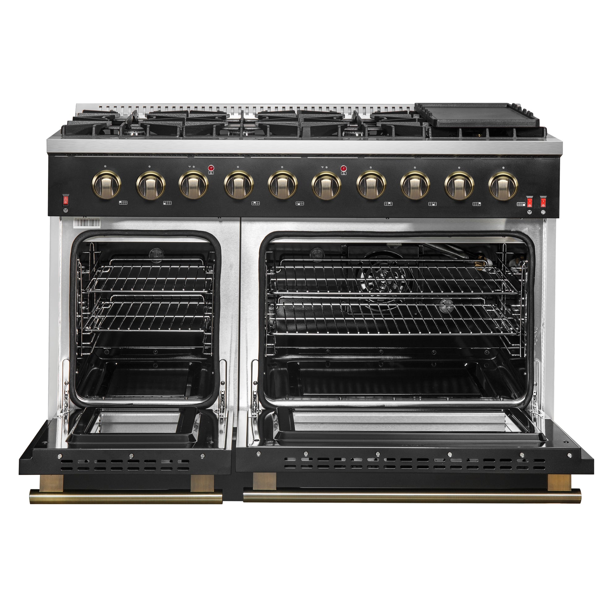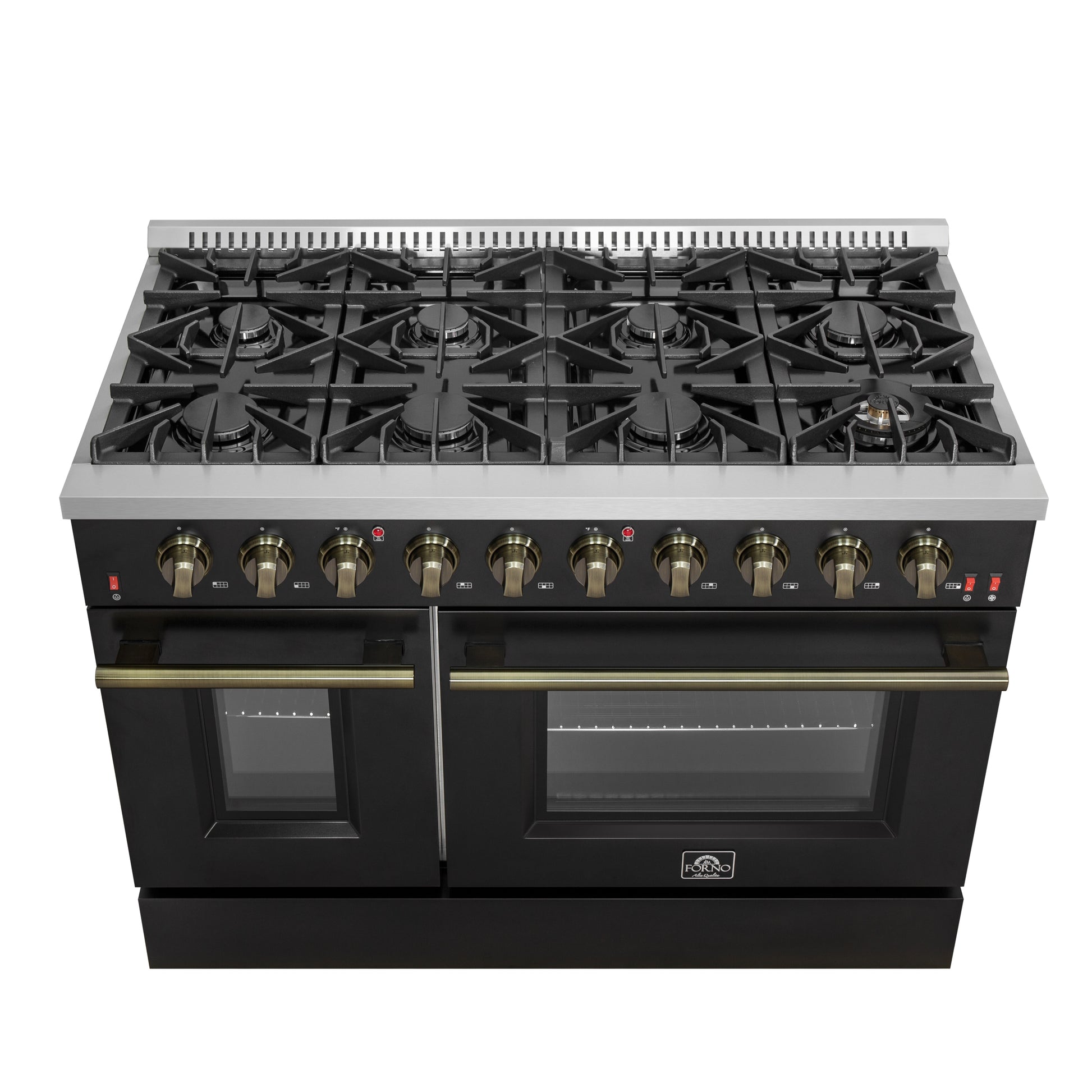 FORNO Galiano 48-inch Gas Range Black & Antique Brass Design, 8 Burners, 107,000 BTU, Griddle, 6.58 cu.ft. Double Ovens