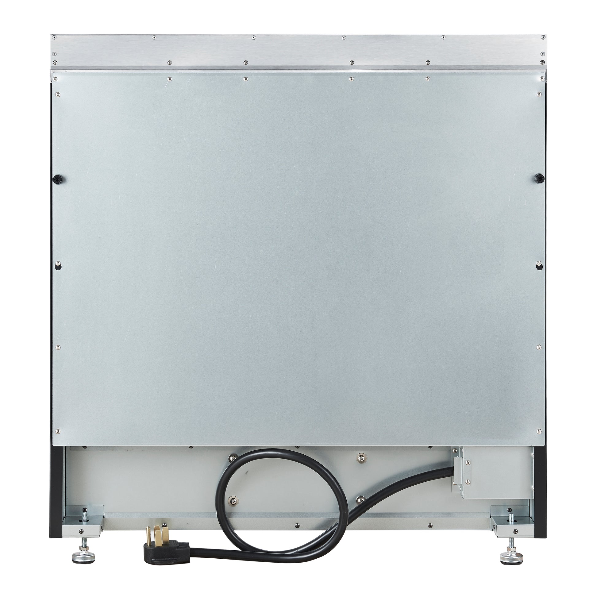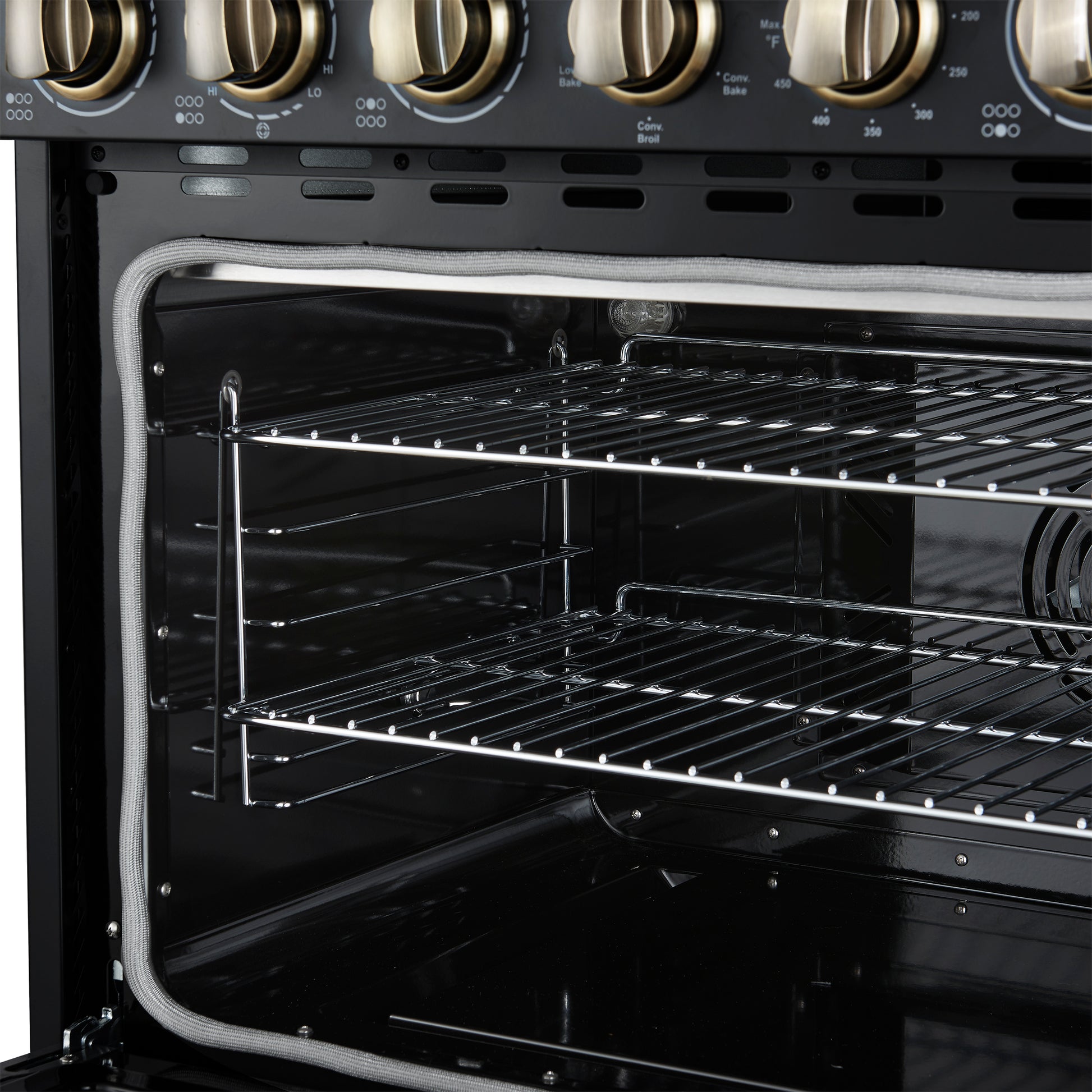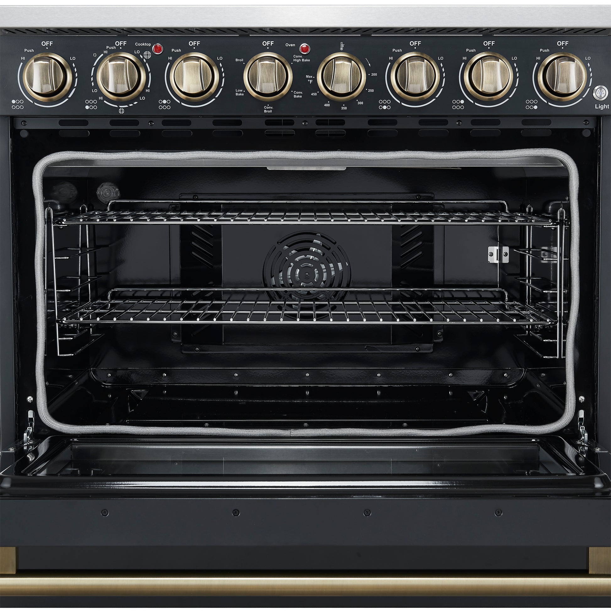 The Forno Paolo 36 Inch electric range in black with antique brass knobs and handles combines power and style for the modern kitchen. Its smooth ceramic glass cooktop features five radiant elements with 9,800 watts of total output. The 5.44 cu. ft. true convection oven delivers fast, even results with a 1,200-watt fan and 3,000-watt high-powered baking and broiling elements. A hidden bake element, bright halogen lights, and a large viewing window add convenience. This freestanding electric range also includes a 100-watt warming zone and dual-element broiler for precise, high-heat cooking.