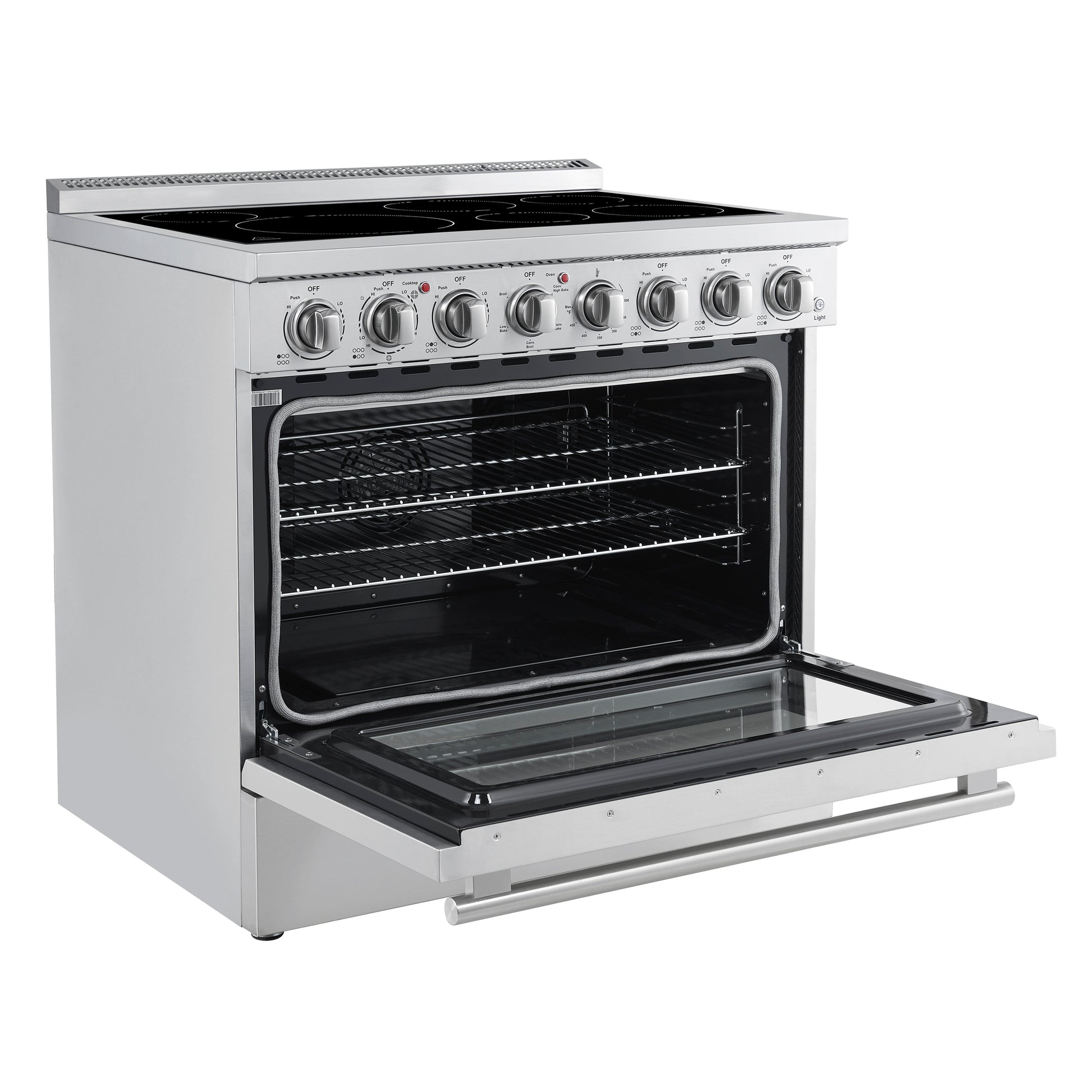 The Forno Paolo 36 Inch electric range in stainless steel combines power and style for the modern kitchen. Its smooth ceramic glass cooktop features five radiant elements with 9,800 watts of total output. The 5.44 cu. ft. true convection oven delivers fast, even results with a 1,200-watt fan and 3,000-watt high-powered baking and broiling elements. A hidden bake element, bright halogen lights, and a large viewing window add convenience. This freestanding electric range also includes a 100-watt warming zone and dual-element broiler for precise, high-heat cooking.
