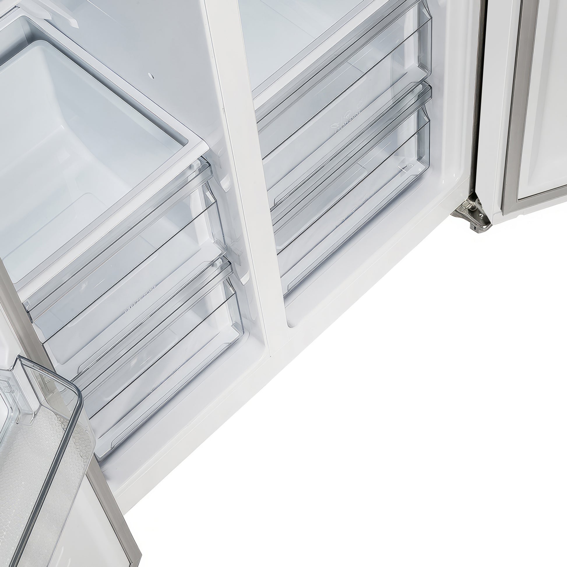 Upgrade your kitchen with the Forno Salerno 33" Side-by-Side Refrigerator in white, designed for functionality and energy-efficient performance. With a 15.6 cu. ft. total capacity, this frost-free refrigerator ensures hassle-free maintenance while keeping your food fresh. Equipped with an advanced temperature control system, this refrigerator maintains optimal cooling levels to preserve food and beverages. The intuitive LED touch panel offers effortless access to settings and controls. The fresh food compartment provides 9.54 cu. ft. of storage space, featuring three adjustable glass shelves, two crisper drawers, and three door bins for organized food storage. The freezer section offers 6.08 cu. ft. of capacity, complete with three adjustable shelves, two pull-out drawers, and three door bins, ensuring easy access to frozen essentials. With Energy Star Certification, the Forno Salerno delivers reliable performance while reducing energy consumption.