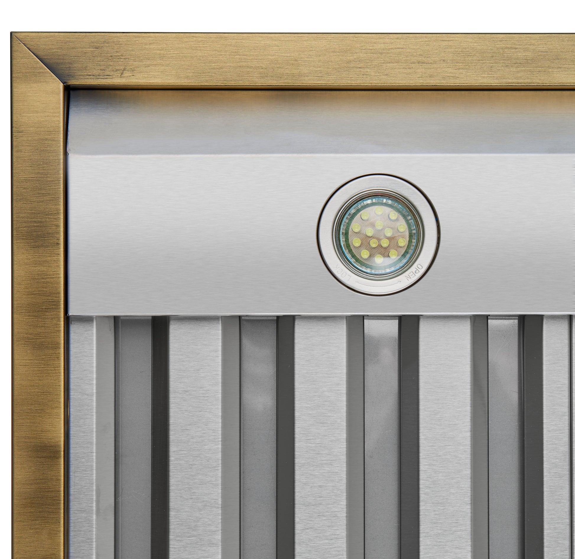 Forno Vittorio 36-Inch Wall Mount Range Hood, Black with Antique Brass Trim, 600 CFM Airflow, Dishwasher-Safe Baffle Filters, Remote Control, 3-Speed Fan, Bright LED Lighting.
