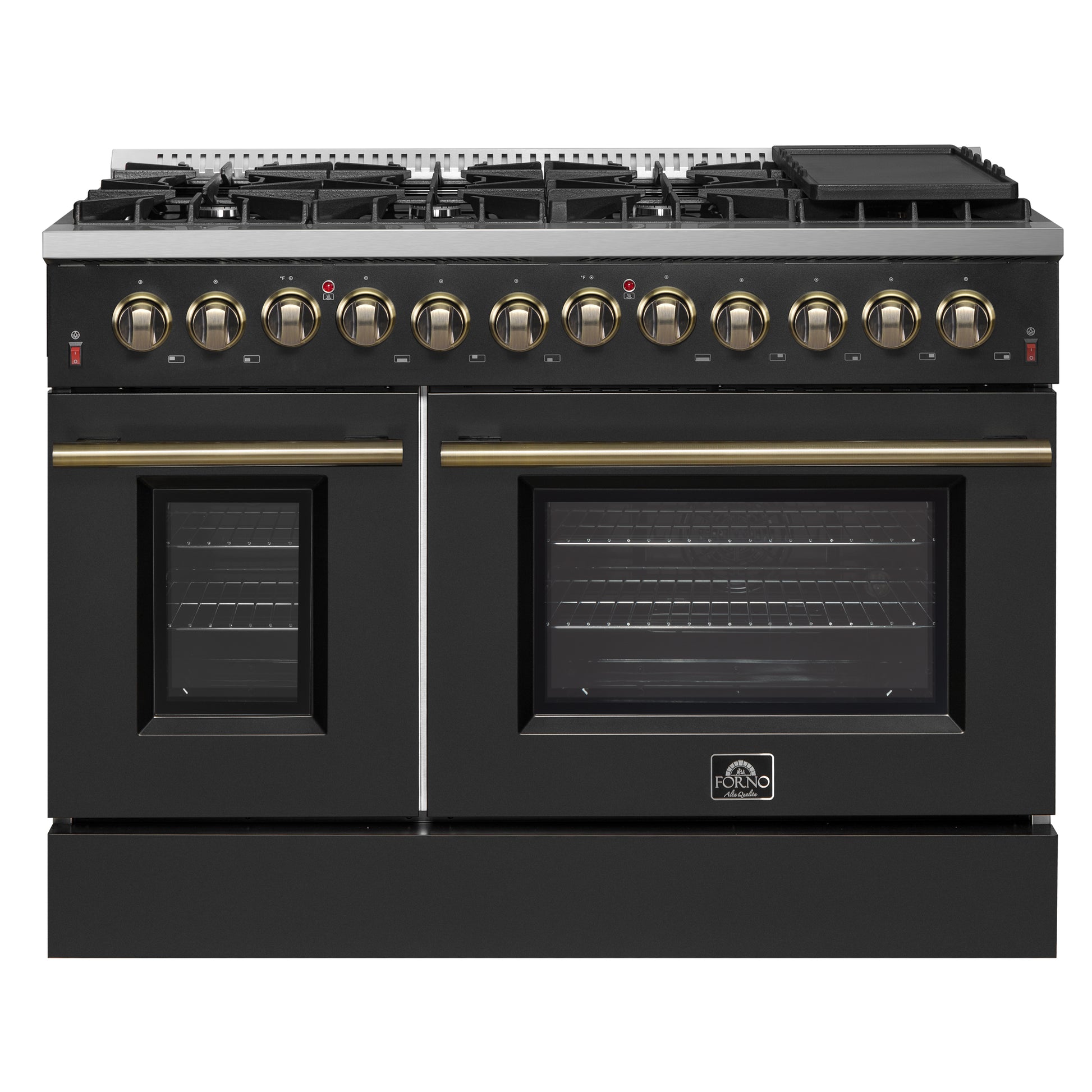 Galiano 48-inch Dual Fuel Range Black & Antique Brass Design with 8 Sealed Burners 107,000 BTU, 6.58 cu. ft. double ovens & Griddle