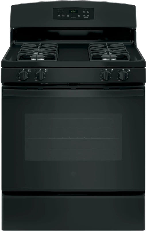 Model#: XGB635DEKBB. - 30" Free-Standing Gas Range. Approx Dimensions (HxDxW): 46 1/4 in X 28 3/4 in X 30 in. - 13,000 BTU burner - Delivers a wide range of heat output ideal for most cooking requirements. - Black matte steel grates - Enjoy a high-end look with a durable, matte coating. - Precise Simmer burner - Delicate foods don't burn with low, even heat. - Self-clean oven - Cleans the oven cavity without the need for scrubbing. - 5.0 cu. ft. oven capacity - Cook more dishes at once. - Sealed cooktop burners - Contains spills and make cleaning quick and easy. - In-oven broil - Healthy meals are hassle-free with in-oven broiling.