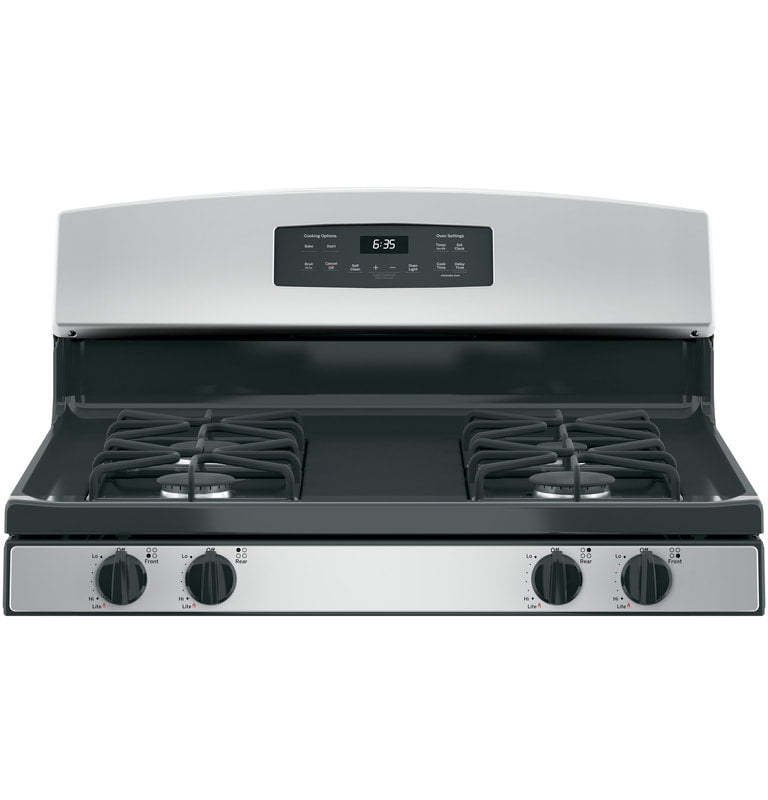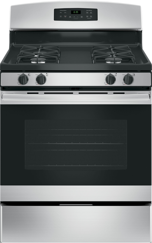 Model#: XGB635REKSS. - 30" Free-Standing Gas Range. Approx Dimensions (HxDxW): 46 1/4 in X 28 3/4 in X 30 in. - 13,000 BTU burner - Delivers a wide range of heat output ideal for most cooking requirements. - Black matte steel grates - Enjoy a high-end look with a durable, matte coating. - Precise Simmer burner - Delicate foods don't burn with low, even heat. - Self-clean oven - Cleans the oven cavity without the need for scrubbing. - 5.0 cu. ft. oven capacity - Cook more dishes at once. - Sealed cooktop burners - Contains spills and make cleaning quick and easy. - In-oven broil - Healthy meals are hassle-free with in-oven broiling.